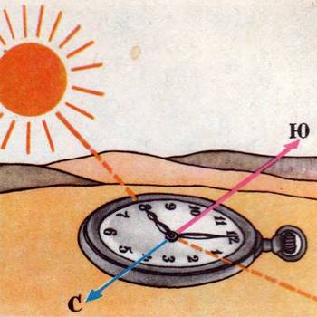 Направление на север в северном полушарии определяют, став в полдень спиной к солнцу. Тень, отброшенная телом, словно стрелка, укажет на север. При этом запад будет по левую руку, а восток по правую. В южном полушарии все наоборот: тень ляжет на юг, а запад и восток окажутся соответственно справа и слева.