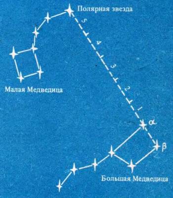 Сориентироваться в ночное время в северном полушарии легче всего по Полярной звезде, которая расположена над Северным полюсом. Отыскать ее на ночном небе помогает созвездие Большая Медведица, имеющее характерное очертание гигантского ковша с ручкой. Если через две крайние звезды ковша провести воображаемую прямую, а расстояние между ними отложить на этой линии пять раз, то на конце последнего отрезка будет видна яркая звезда – это и есть Полярная (рис. 4).