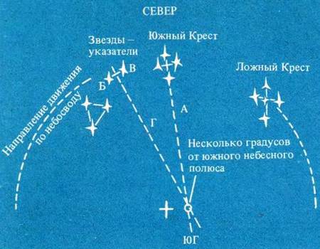 Для более точного определения небесного Южного полюса пользуются двумя звездами-указателями, расположенными слева от Южного Креста. Соединив их воображаемой линией (Б – В) через ее середину, проводят перпендикуляр (Г), который продолжают до пересечения с линией А. Точка пересечения находится практически над самым Южным полюсом (рис. 5). Истинный Южный Крест иногда путают с ложным.