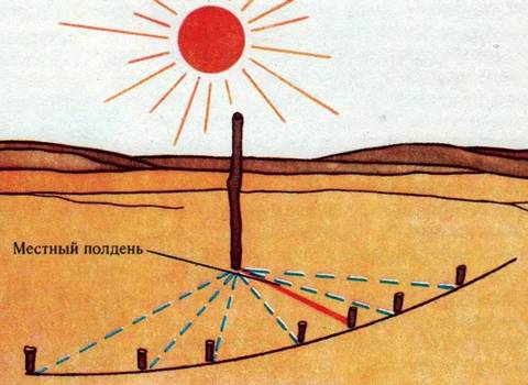Рис. 7. Определение местного полдня. Самая короткая тень указывает местный полдень