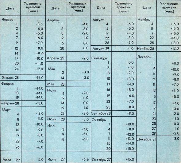 Местный полдень определяют с помощью шеста длиной 1-1,5 м и нескольких колышков. Шест втыкают в землю строго вертикально (это легко проверить самым простейшим отвесом), а затем, по мере приближения солнца к зениту, отмечают колышками край тени, отбрасываемой шестом. Тень, перемещаясь, постепенно укорачивается, и тот момент, когда она стала самой короткой, и есть местный полдень, т. е. прохождение солнца через данный меридиан (рис. 7). Теперь остается только записать показания часов и произвести несложный расчет. При переводе часов в градусы исходят из того, что 1 час соответствует 15°4', минута – 1°4', секунда – 1' долготы. Следует учесть, что угловая скорость движения солнца меняется в зависимости от времени года, и поэтому в расчет необходимо ввести поправку, взятую из таблицы уравнения времени (рис. 8). В зависимости от знака, стоящего перед поправкой, ее либо вычитают, либо прибавляют.