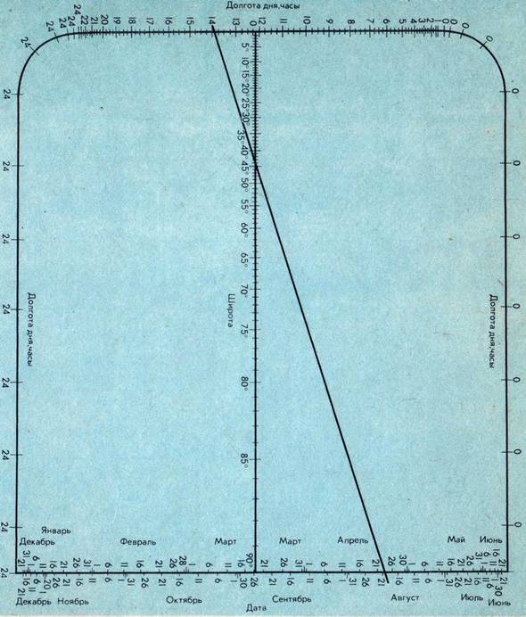 Для определения северных широт необходимо: замерить долготу дня с момента появления вершины солнечного диска над горизонтом океана при восходе до момента его полного исчезновения за горизонтом при заходе; найти на левой шкале цифру полученной долготы дня и соединить ее с соответствующей датой на правой шкале с помощью линейки или натянутой нити. В точке пересечения линейки или нити с горизонтальной шкалой широт находится искомая широта; пример: 20 августа замеренная долгота дня 13 час. 54 мин. Широта по номограмме 45°ЗО'. Для определения южных широт следует: прибавить 6 месяцев к соответствующей дате и по новой дате определить широту, как указано выше. Пример: 11 мая замеренная долгота дня 10 час. 04 мин. Прибавив 6 месяцев, получим 11 ноября Широта по номограмме 41°30' ю. ш. При использовании номограмма должна представлять совершенно ровную поверхность.