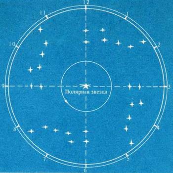 Ночью можно воспользоваться «звездными часами». Циферблатом для них служит небосвод с Полярной звездой в центре, а стрелкой – воображаемая линия, проведенная к ней через две звезды ковша Большой Медведицы (рис. 6).
