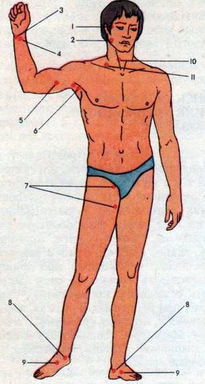 Рис. 15. Точка прижатия артерий: 1 – височной, 2 – наружной челюстной, 3 – локтевой, 4 —лучевой, 5 – плечевой, 6 – подмышечной, 7 – бедренной, 8 – задней большеберцовой, 9 —передней большеберцовой, 10 – правой сонной, 11 – подключичной.