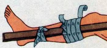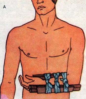 Если нет никаких подручных средств для изготовления шины, тогда, например, при переломах руки ее для создания неподвижности можно прибинтовать к туловищу, согнув в локтевом суставе под углом 90°, а кисть повернув ладонью к груди; сломанную ногу можно прибинтовать к здоровой.