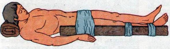 Задача первой помощи – уменьшить боль, обеспечить раненому полный покой и, главное, не допустить повреждения мягких тканей (мышц, сухожилий), окружающих место перелома. Пострадавшего следует уложить, успокоить, дать обезболивающее средство (анальгин, промедол) и создать неподвижность поврежденной конечности. Оказывая помощь при закрытых переломах, не следует без особой необходимости снимать одежду, обувь с поврежденной части тела. Их лишь разрезают в нужном месте.
