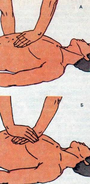 Среди многочисленных методов искусственного дыхания, применяемых в настоящее время для оказания неотложной помощи, наиболее эффективен метод «рот в рот». Пострадавшего укладывают на спину и, очистив рот, нос и горло от крови, слюны, рвотных масс и т. п. (рис. 23), немедленно приступают к искусственному дыханию, а чтобы облегчить доступ воздуха в легкие, голову пострадавшего максимально запрокидывают назад. Вставив большой палец левой руки между зубами, оттягивают вниз нижнюю челюсть и удерживают ее в этом положении. Зажав ему нос большим и указательным пальцами правой руки, делают глубокий вдох, а затем, плотно прижав рот ко рту пострадавшего, производят быстрый энергичный выдох. Как только грудная клетка расширится, дают воздуху выйти из легких (пассивный выдох). Прием повторяют с частотой 12-14 раз в минуту. При отсутствии пульса искусственное дыхание сочетают с непрямым массажем сердца. Техника массажа проста. Став с правой стороны от пострадавшего, оказывающий помощь кладет ему на нижнюю треть грудины свою руку ладонью вниз (рис. 24а), поверх нее – другую, обращенную пальцами к подбородку пострадавшего (рис. 24б), и производит 3-4 ритмических нажатия, чередуя их каждые 15-30 секунд с вдуванием воздуха. Непрямой массаж сердца проводится строго в ритме 50-60 надавливаний в минуту. Надавливают на грудину резким толчком так, чтобы она сместилась не менее чем на 3-4 см. Чтобы дать грудной клетке свободно расправиться, после каждого нажатия руки быстро отнимают.
