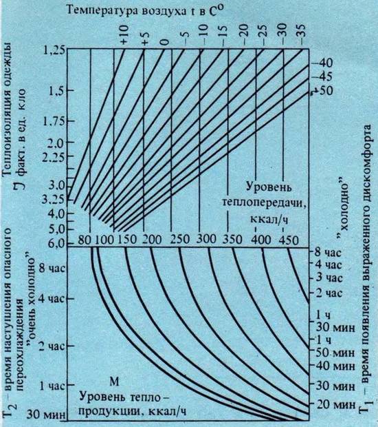 Пользуясь этой номограммой, можно решать любые задачи по ориентировочному прогнозированию допустимых интервалов времени пребывания человека на холоде, если известны следующие исходные параметры: а) теплоизоляционные свойства одежды (1факт ), взятые для ожидаемых условий (покой, физическая нагрузка, без ветра, при ветре); возможна и приближенная оценка фактической теплоизоляции комплекта; б) температура воздуха (реальная или предполагаемая); в) уровень физической нагрузки (измеренный, определенный по таблицам энерготрат или ожидаемый), при расчете можно использовать также величину энерготрат, требуемых для предотвращения замерзания человека до принятия мер к его спасению; г) допустимая в данной обстановке степень дискомфорта («холодно» или «очень холодно»).
