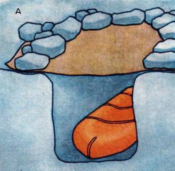 Для этой цели в их распоряжении самый идеальный строительный материал – снег. Его легко пилить, резать. Снежным глыбам можно без усилий придавать любую форму, «на ходу» изменять размеры. Блоки из снега не скользят благодаря его липкости и, приложенные один к другому, через 5-10 минут образуют единый монолит. Но главное то, что снег – отличный теплоизолятор из-за высокого содержания воздуха (до 90%), заполняющего пространство между снежными кристаллами (Чекотилло, 1945: Кузнецов, 1949). Вследствие этого температура воздуха в снежных убежищах обычно на 15-20° выше наружной. А при кратковременном (3-4 часа) обогреве стеариновой свечой или таблетками сухого горючего температуру воздуха в снежной пещере удавалось поднять до 0°, а в иглу до минус 3°, в то время как термометр, висевший снаружи, показывал 18-27° мороза.