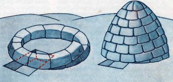 Нарезав 15-20 блоков, по периметру окружности укладывают первый ряд. Потом производят разрез по диагонали от верхней кромки одного из блоков первого ряда до ее нижней кромки. В образовавшуюся выемку укладывают первый блок второго яруса и т.д., продолжая укладку по спирали. При этом каждая глыба последующего ряда укладывается под несколько большим наклоном, чем предыдущая. В результате получится хижина с более или менее правильным куполом. Закончив укладку стен, отверстия между блоками затирают снегом. Со стороны траншеи в стенке иглу прорезают входное отверстие.