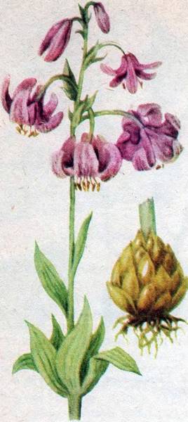 Среди таежного разнотравья издалека на себя обращают внимание крупные пурпурные, с фиолетовыми пятнами цветы на длинных, до полутора метров, стеблях. Это лилия кудреватая, или саранка (Lilium martagon L.). Ее мясистую луковицу можно печь и отваривать (рис. 61).