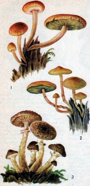 Рис. 66. Ложные опята: 1 – кирпично-красный, 2 – черно-желтый. 3 – Настоящий, или осенний опенок