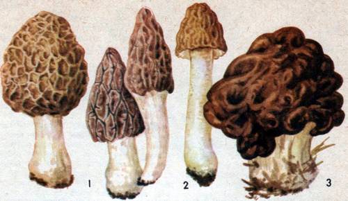 Рис. 68. 1 – сморчки, 2 – сморчковая шапочка, 3 – строчек