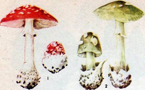 Рис. 70. 1 – мухомор, 2 – бледная поганка