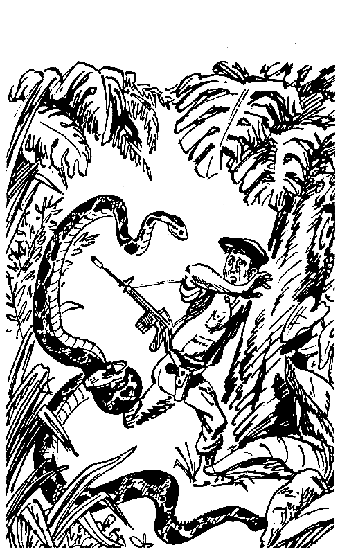 Человек этот извивался, стараясь избавиться от змеи, которая легко и даже как будто изящно покачивала своей страшной головой над его беретом, а сама все сильнее и сильнее сжимала тугие, лоснящиеся кольца своего могучего тела. В какое-то мгновение сил у человека не хватило, и он сдался. Змея неуловимо быстро расправила кольца, бросила свою жертву и заструилась куда-то дальше, между корней и лиан, то сливаясь с ними, то, освещенная косым лучом солнца, словно вспыхивала, красуясь своей страшной, пробивной силой.