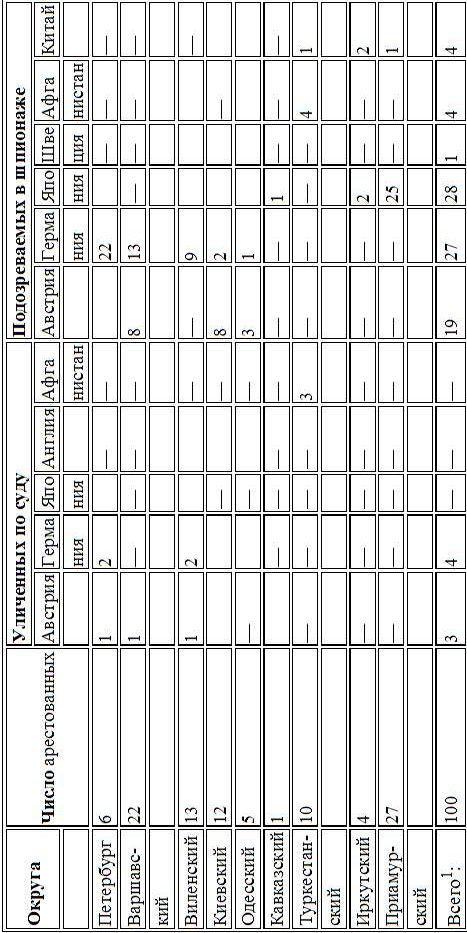 Представление об арестах по подозрению, число осужденных за шпионаж и сотрудничество с иностранной разведкой в 1911–1913 гг. дает таблица, составленная в Регистрационном отделении особого производства Главного Управления Генерального Штаба в 1913 г. РГВИА. Ф. 2000. Оп. 15. Д. 297. Л. 9 об. – 10.