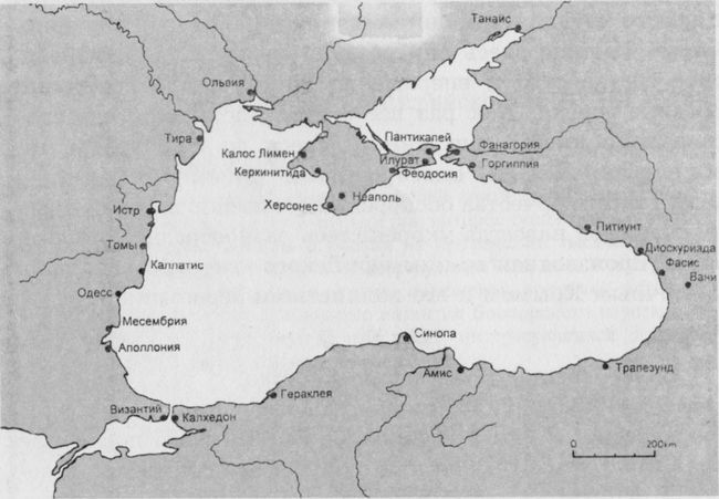 Очевидно, лишь после того, как греки из Малой Азии окончательно убедились в том, что киммерийцы никогда не возвратятся на свою бывшую родину, поскольку явно верили в их проживание там, они решились переселиться на никем еще незаселенную землю. Со времени основания первого греческого поселения Борисфен около середины VII в. до н. э. на современном острове Березань в Черном море прошло, очевидно, немногим более полстолетия, когда выходцы из Ионии под предводительством Милета занялись почти одновременно интенсивным освоением земель в Нижнем Побужье, Восточном Крыму и на Таманском полуострове.