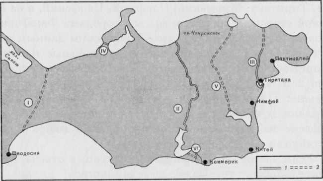 Расположение валов на Керченском полуострове: 1 – существующие валы; 2 – несохранившиеся валы. I – Акмонайский; II – Узунларский; III – Тиритакский; IV – Акташский; V – вал «Безкровного» (Чокракский); VI – Элькенский. По А.А. Масленникову