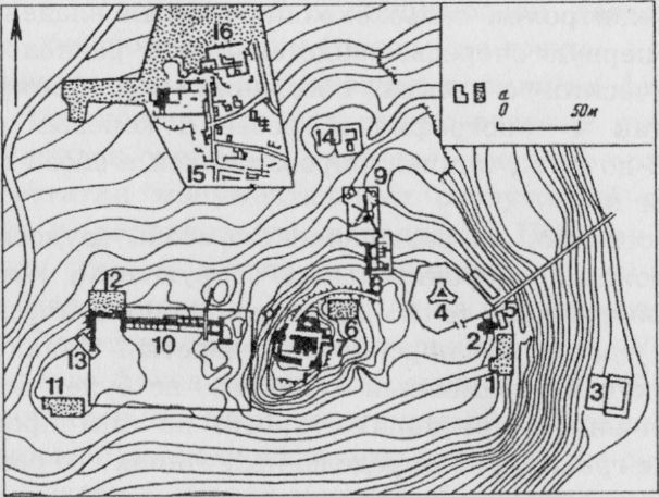 Схематический план Пантикапея: 1-16 – раскопы на территории древнего городища по В.П. Толстикову