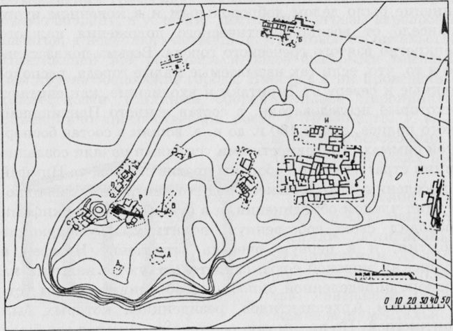 Схематический план Мирмекия с местами раскопов по Ю.А. Виноградову