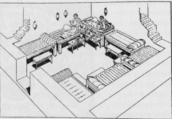 Многочисленные изображения трапез на посвятительных и надгробных стелах дают ясное представление о сервировке стола и отдельных деталях интерьера. Чаще всего мужчина, полулежа на ложе с подушками и покрывалами, держит в руке чашу для питья вина. Рядом в кресле в парадном драпированном костюме сидит жена, поставив ноги на маленький стульчик. На столе лежат хлебные лепешки, несколько сосудов с пищей. Ридом стоит большой кратер или гидрия, из которых мальчик-прислужник черпает вино киафом с длинной ручкой. В царских семьях сервировка стола отличалась, конечно, богатством и разнообразием сосудов из золота, серебра и бронзы. В их владении находились и высокохудожественные краснофигурные, чаще всего с позолотой сосуды. Краснофигурные сосуды для вина через посредство боспорских купцов или в виде даров поступали и к скифской элите.