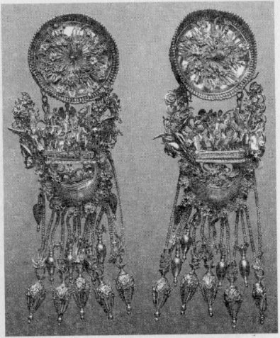 Украшения: 1 – золотая височная подвеска с головой Афины Партенос; 2 – золотая серьга роскошного стиля. Курган Куль-Оба. IV в. до н. э.