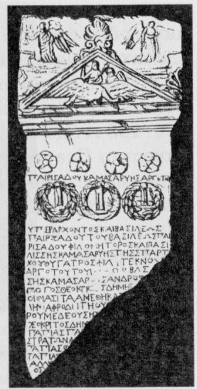 Совсем недавно в Неаполе Скифском обнаружена уникальная для скифского мира стихотворная эпитафия, свидетельствующая о том, что в этой крепости был похоронен могучий Аргот, повелитель Скифии. Имя этого вождя такое же, как и у второго супруга Камасарии. Поэтому исследователи эпитафии уверенно считают, что боспорская царица была замужем именно за этим Ар готом. Однако почему он оказался похороненным не на Боспоре и почему в боспорской надписи не отмечен его титул, остается пока не ясным.