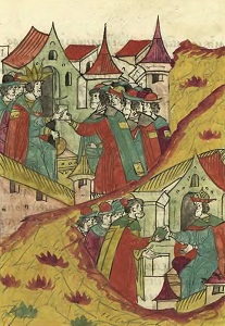 Иван Грозный отпускает литовских послов с обидными грамотами. Миниатюра из Лицевого летописного свода, т. 23