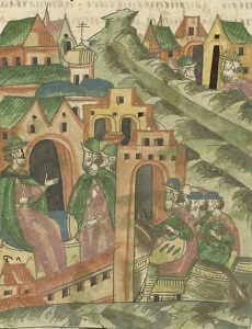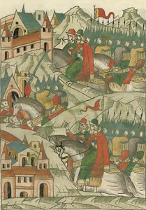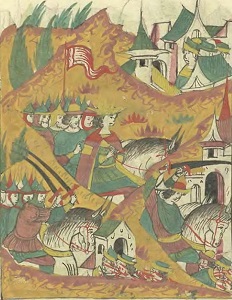 Русские войска разоряют окрестности Дерпта-Юрьева. Миниатюра из Лицевого летописного свода