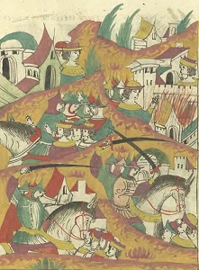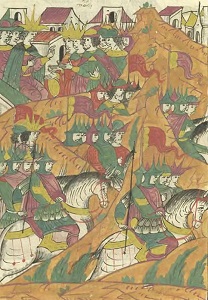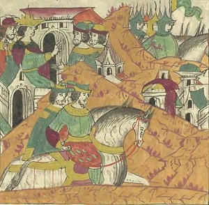 Русские войска наносят поражение силам дерптского епископа. Миниатюра из Лицевого летописного свода