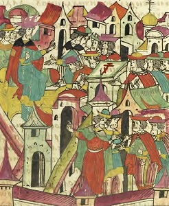 Русская пехота и конница вступает в Нарву. Миниатюра из Лицевого летописного свода