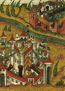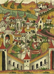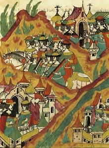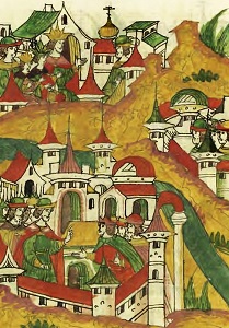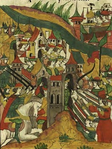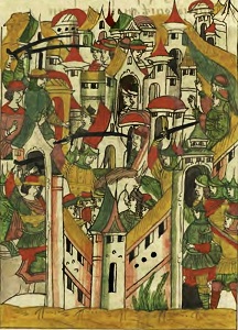 Русские ратники штурмуют Нарву. Миниатюра из Лицевого летописного свода