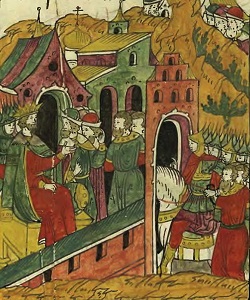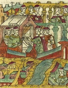 Допрос немецких языков в Юрьеве. Миниатюра из Лицевого летописного свода