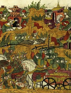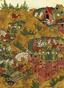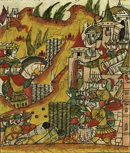 Вылазка русских из осажденного Юрьева. Миниатюра из Лицевого летописного свода