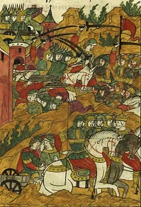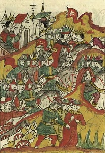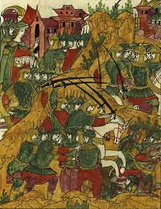 Выступление русской рати на помощь Юрьеву. Миниатюра из Лицевого летописного свода
