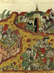 Осада Юрьева ливонцами. Миниатюра из Лицевого летописного свода