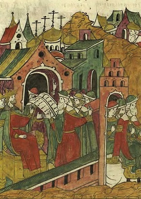 Иван Грозный передаёт литовским послам обидные списки о порубежных шкодах. Миниатюра из Лицевого свода