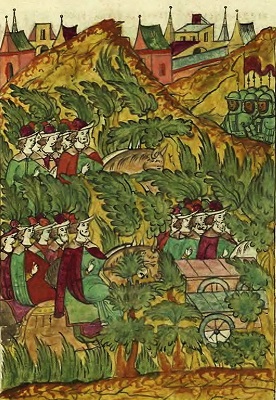 К этому описанию добавим ещё пару немаловажных деталей. За каждым полком тянулся его обоз-кош. Как сказано было в «походном дневнике» Ивана Грозного, описывающем день за днём события в ходе экспедиции на Полоцк, «а кошем приговорил (Иван Грозный – прим. авт.) идти за полки, которые кошевники которого полку, и тем всякому идти за своим полком». Этот момент для дальнейшего нашего повествования имеет особое значение. По старому русскому обычаю, ратники на походе ехали налегке, сложив оружие и доспехи в обозе. Как в кампанию 1377 года на реке Пьяна: «доспехи своя на телеги и в сумы скуташа, рогатины и сулицы и копья не приготовлены, а инии еще и не насажени была, такоже и щиты и шоломы». Чтобы изготовиться к бою, ратникам нужно было время вооружиться и одоспешиться.