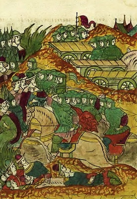 Рать Шуйского на марше. В правом верхнем углу – литовское войско в засаде. Миниатюра из Лицевого летописного свода