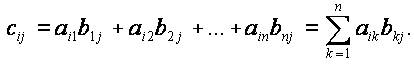 5. Умножение матриц. По многим соображениям целесообразно определить эту операцию следующим образом: Произведением матрицы A размера (m × n) на матрицу B размера (n × r) является матрица C = AB размера (m × r), элемент cij которой, расположенный в ij-клетке, равен сумме произведений элементов i-й строки матрица A на соответствующие элементы j-го столбца матрицы B, т.е.