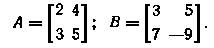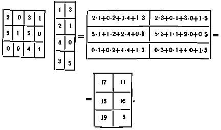 Умножение А на В допустимо (произведение АВ существует) если число столбцов А равно числу строк В ( в таких случаях говорят, что эти две матрицы согласуются по форме). Пример: