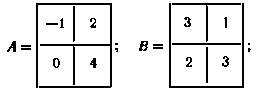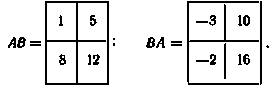 Для матриц A (m × n) и B(n × m) существует как произведение АВ размера m × m, так и произведение BA размера n × n. Ясно, что при m × n эти произведения не могут быть равными уже вследствие различных размеров результирующих матриц. Но даже при m = n, т.е. в случае квадратных матриц одинакового порядка, произведения АВ и ВА не обязательно равны между собой. Например, для матриц