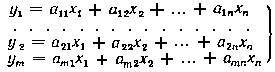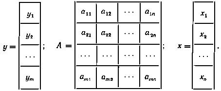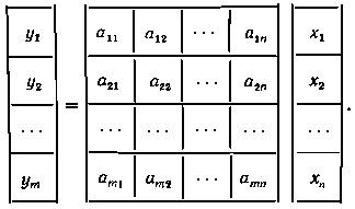 8. Линейные преобразования. Систему уравнений, записанную в начале предыдущего пункта, можно рассматривать как линейное преобразование совокупности величин x1, x2, ..., xn в совокупность y1, y2, ..., ym. Это преобразование полностью определяется коэффициентами aij (i = 1, 2, ..., m; j = 1, 2, ..., n). На языке матриц линейное преобразование y = Ax означает преобразование столбца х в столбец у, которое определяется матрицей преобразования А.
