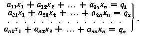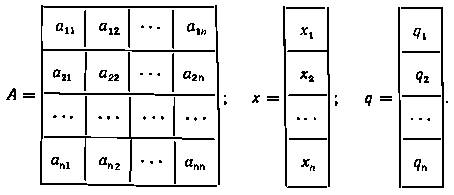 В матричной форме эта система уравнений запишется как Ax = q, где А – квадратная матрица n-го порядка, называемая матрицей системы: x и q – столбцевые матрицы неизвестных переменных и свободных членов: