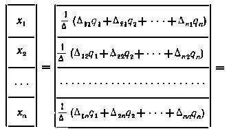 Записав для всех элементов столбцевой матрицы x выражения по правилам Крамера, получим решение системы уравнений в виде: