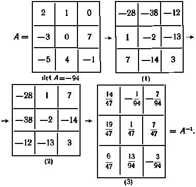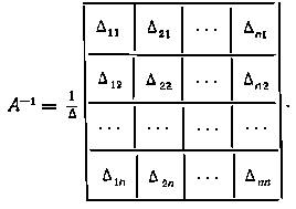 Из полученного выражения следует правило определения обратной матрицы: 1) элементы aij данной матрицы A n-го порядка заменяются их алгебраическими дополнениями Δij: 2) матрица алгебраических дополнений транспонируется, в результате чего получаем присоединенную или взаимную матрицу к А ( она обозначается через AdjA); 3) вычисляется определитель Δ матрицы А и присоединенная матрица AdjA умножается на величину, обратную этому определителю.