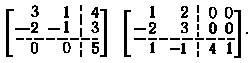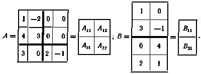 Пусть, например, матрицы А и В разбиты на блоки (жирными линиями) так, чтобы для соответствующих блоков имела смысл операция умножения, т.е.