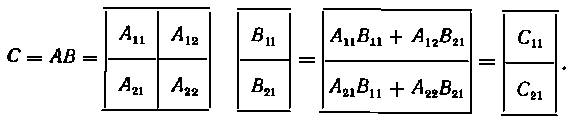 Конечно, тот же результат получается и при непосредственном перемножении матриц. Но разбиение на блоки позволяет оперировать с матрицами меньших размеров ( это бывает необходимо, например, когда не хватает места на бумаге или ячеек оперативной памяти машины) и особенно удобно, если можно выделить нулевые блоки.