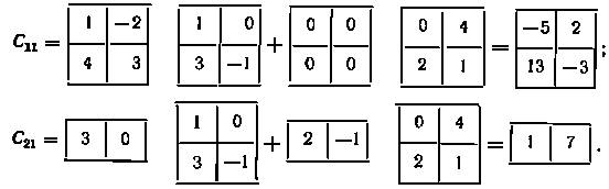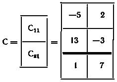 10. Блочные матрицы. Часто матрицу удобно разбить вертикальными и горизонтальными линиями на блоки которые являются матрицами меньших размеров и при выполнении операций рассматриваются как элементы исходных матриц. Операции над блочными матрицами выполняются по сформулированным выше правилам при условии, что эти операции допускаются размерами соответствующих матриц.