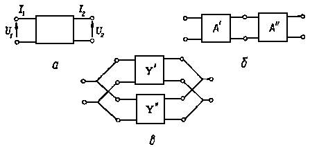Рис. 6. Соединение четырехполюсника: а – четырехполюсник; б – последовательное соединение; в – параллельное соединение.